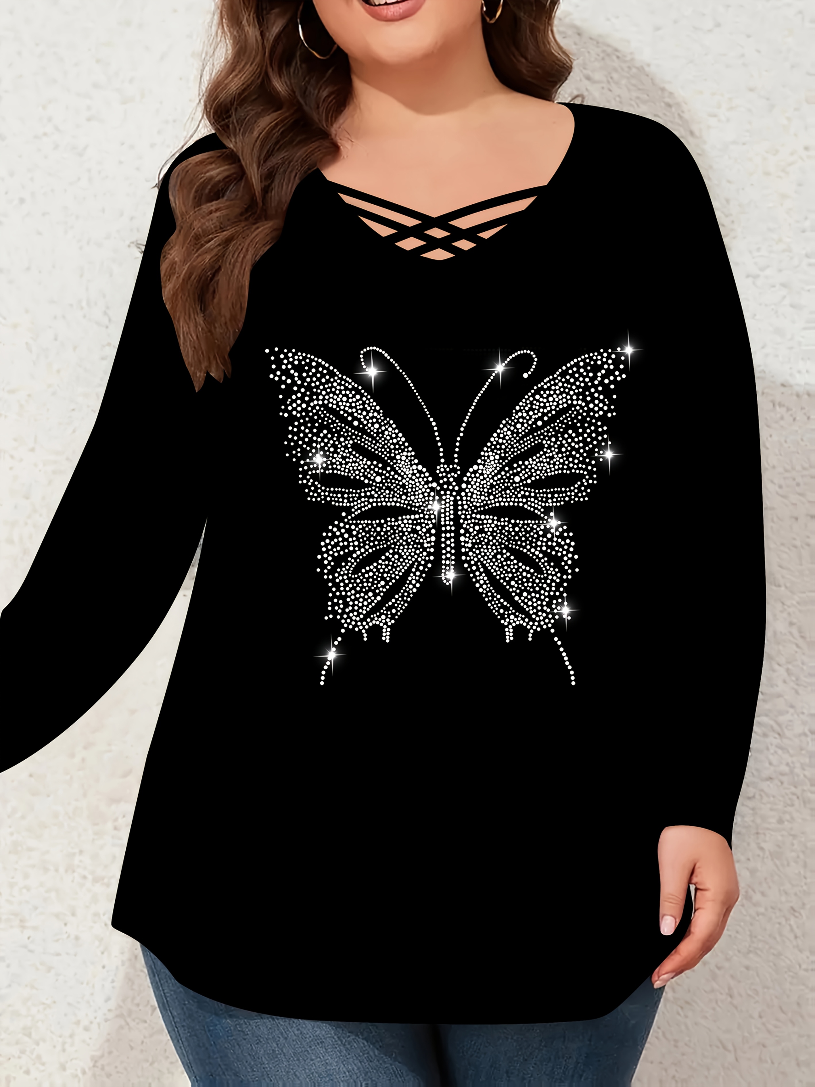 Elegant Plus Size Women's Rhinestone Butterfly Top • V-Neck Cross Strap Long Sleeves • Formal Party & Everyday Chic Blouse • Machine Washable Winter Clothing