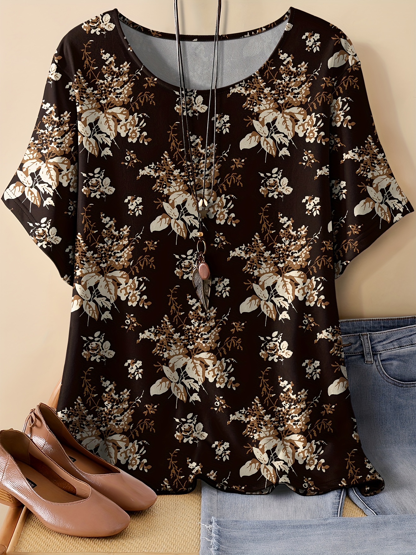 Plus Size, Oriented Plus Size Retro Multicolor Floral Print T-Shirt with Round Neck, Casual Spring/Summer Short Sleeve Top for Women - No Accessories Included