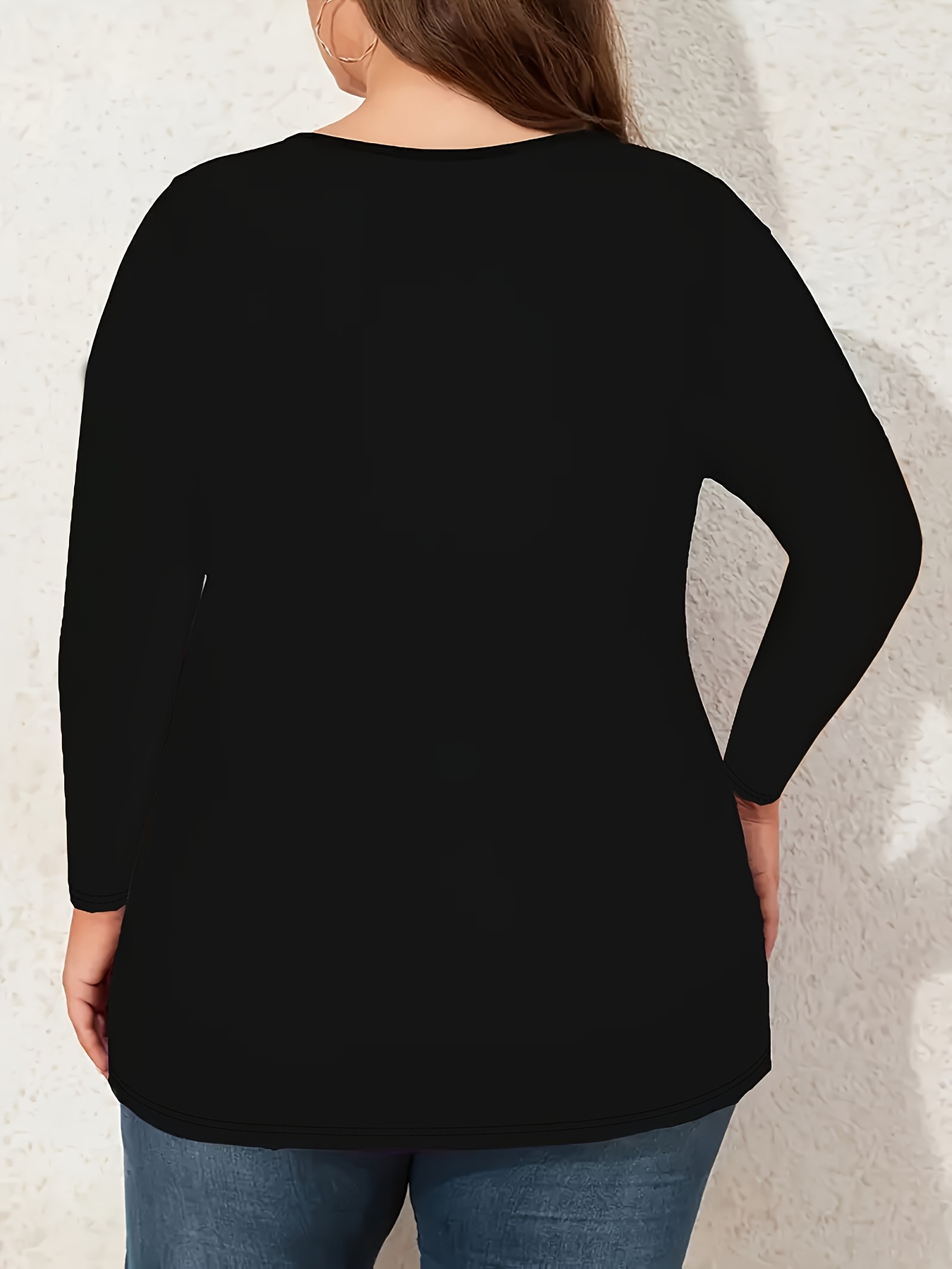 Plus Size - Plus Size Women'S Elegant V-Neck Long Sleeve T-Shirt with Rhinestone Heart & Bow Design - Stretchy Comfort Fit, Black & White Contrast, Cross Strap Detail, Autumn/Winter Fashion Top, Ladies T Shirts, Winter Clothing, Medium Stretch Fabric