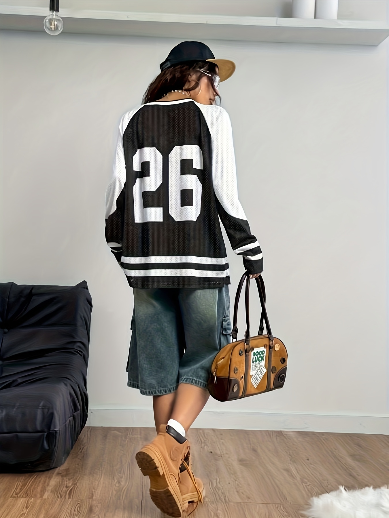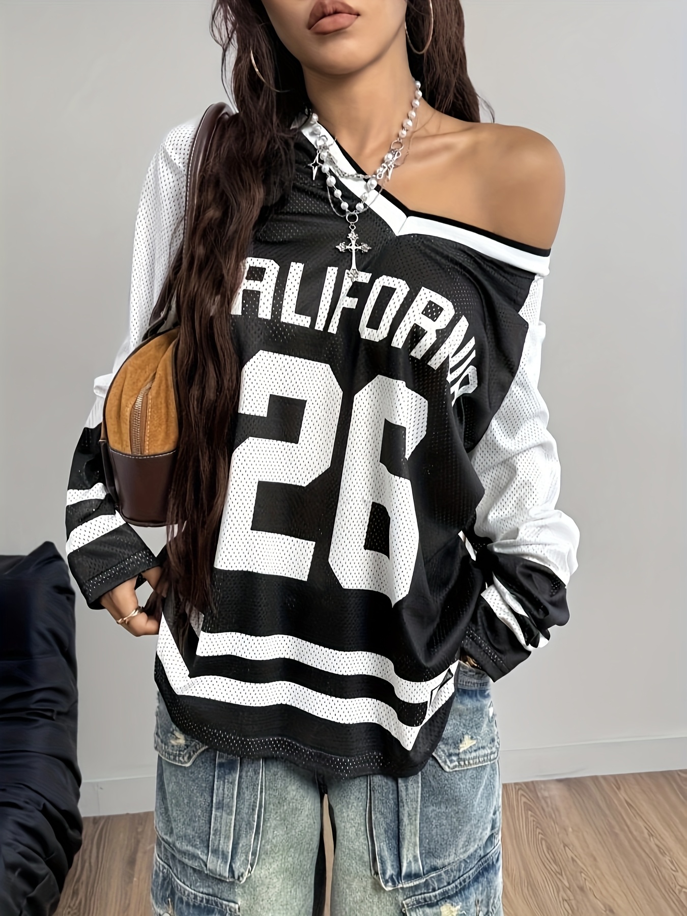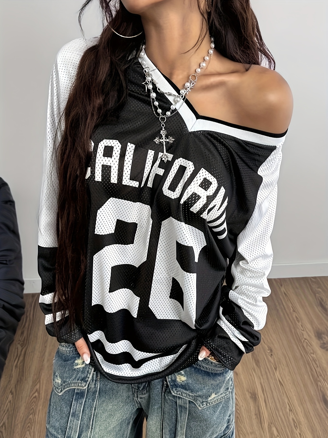 [Soft Stretch V-Neck T-Shirt] Soft Stretch Fabric Women's Casual V-Neck Long Sleeve T-Shirt | California 26 Letter Print, Black & White Striped Mesh Overlay, All-Season Comfort for Casual Attire | Vneck Design | Mesh Overlay Shirt