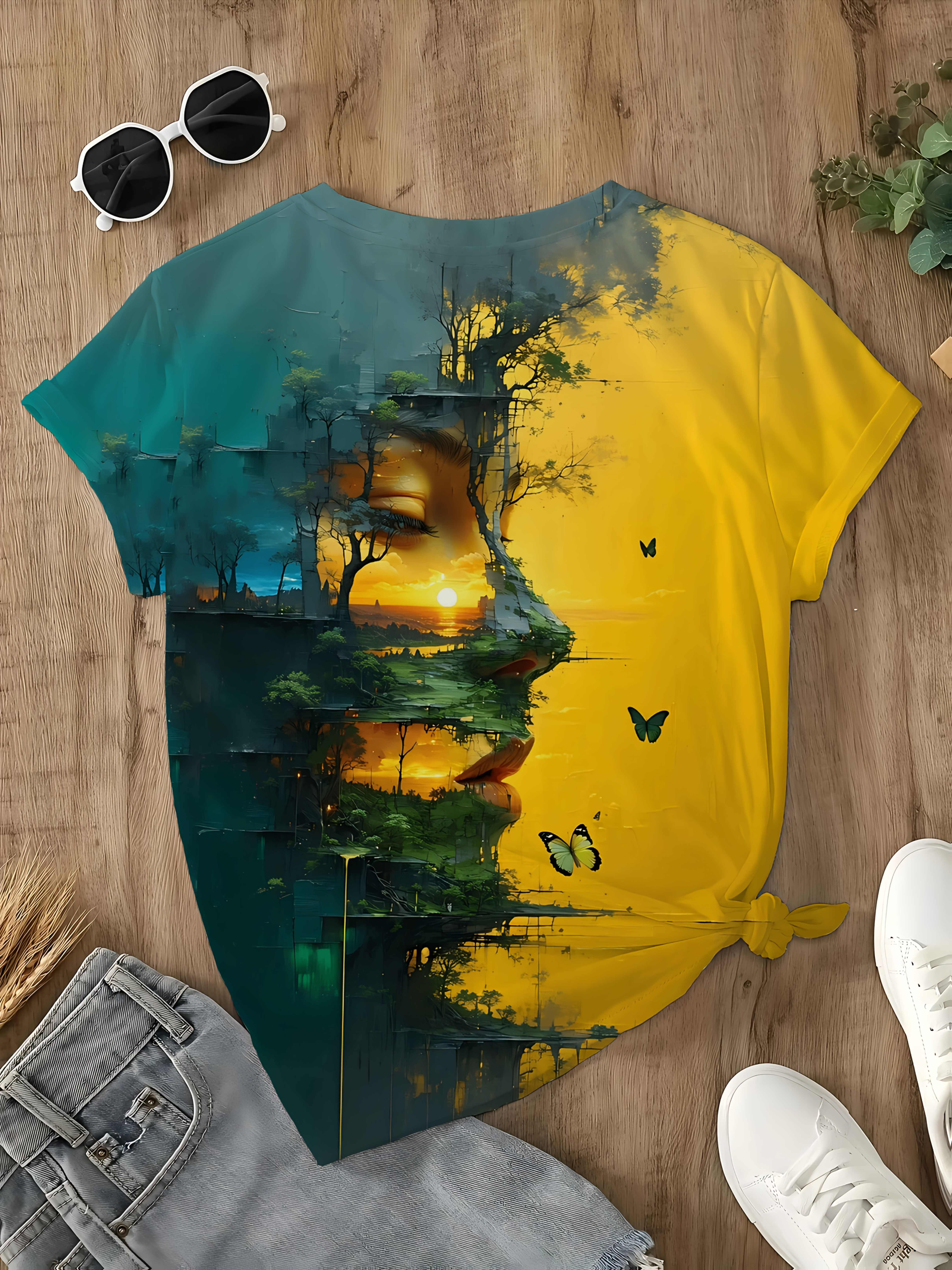 Women'S Artistic Print T-Shirt - High-Quality, Breathable Polyester, Green Forest Sunset Design with Butterflies - Casual & Comfortable for Casual Attire, Perfect for Spring/Summer/Fall