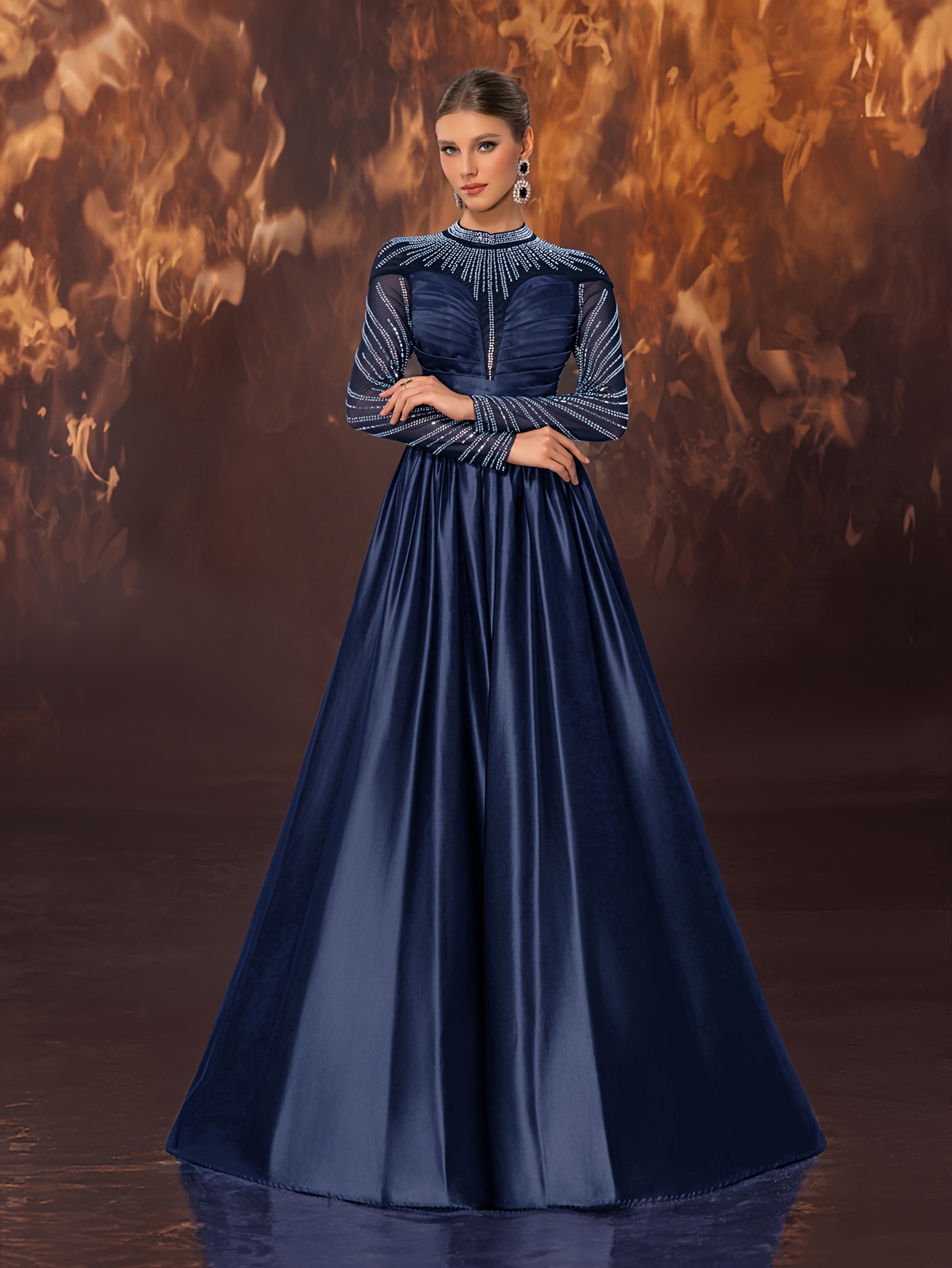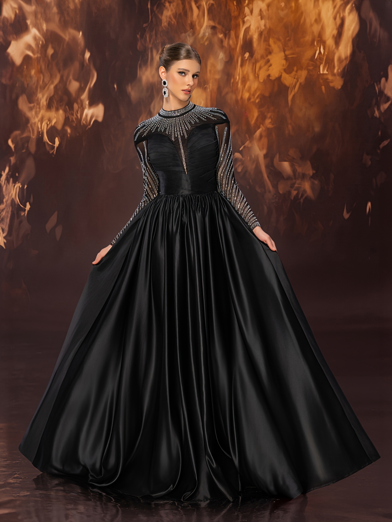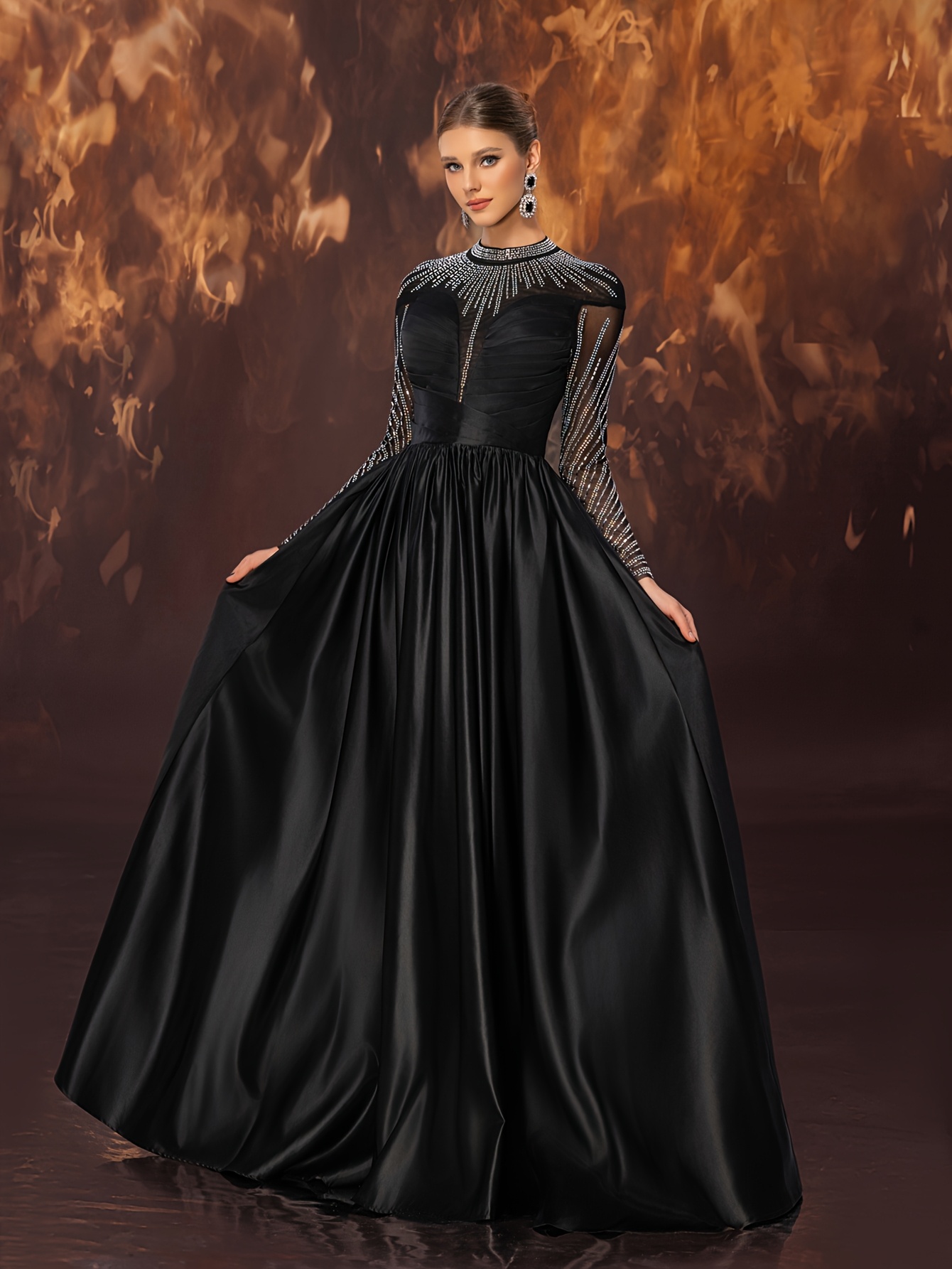 Women's Elegant Black Evening Gown - Satin & Mesh Cocktail Dress with Stand-Up Collar, Rhinestone Embellishments, Fitted Silhouette & Micro-Stretch Fabric for Galas, Weddings, Formal Parties