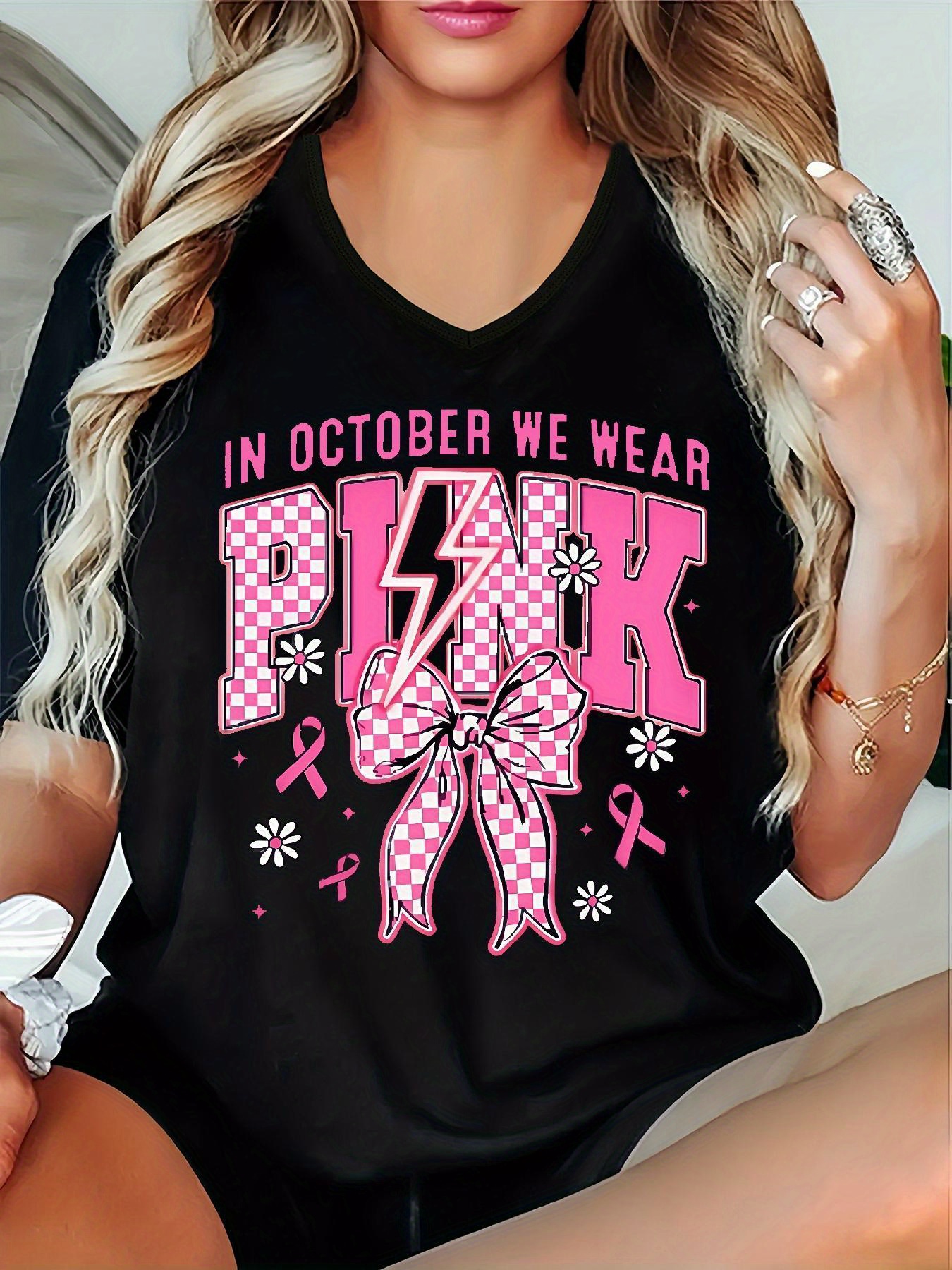 Women'S Pink "PINK" Graphic T-Shirt with Ribbon Design - Casual V-Neck, Short Sleeve, Micro-Elastic Fabric, Breast Cancer Awareness, Breast Cancer Awareness Shirt | Playful Print Top | Comfortable Fit, Breast Cancer Awareness Shirt