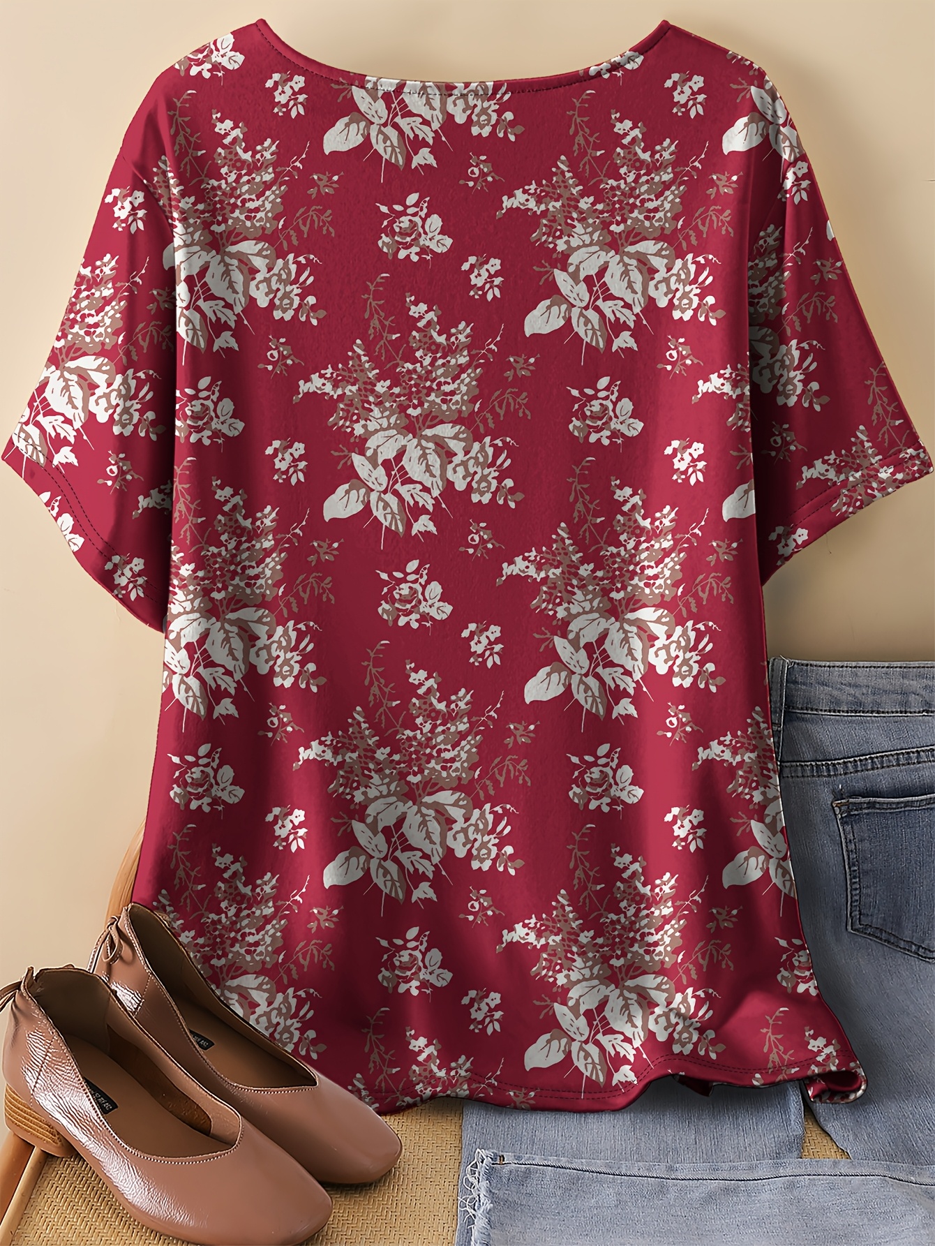 Plus Size, Oriented Plus Size Retro Multicolor Floral Print T-Shirt with Round Neck, Casual Spring/Summer Short Sleeve Top for Women - No Accessories Included