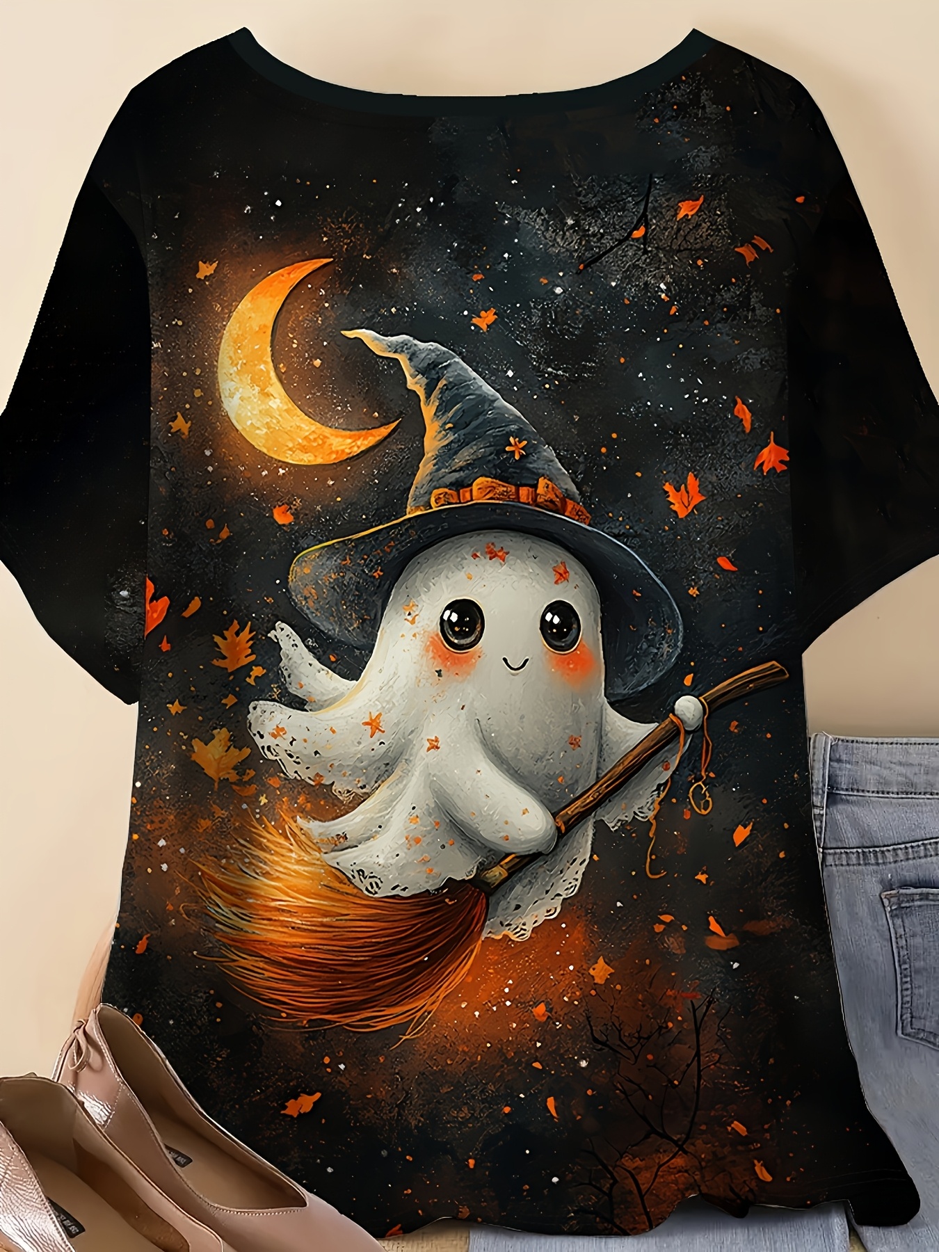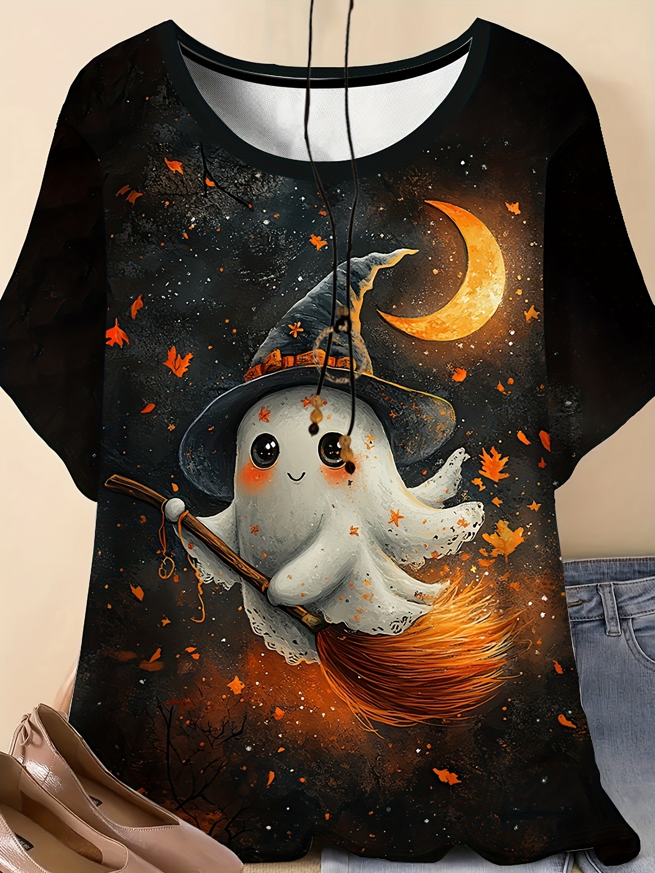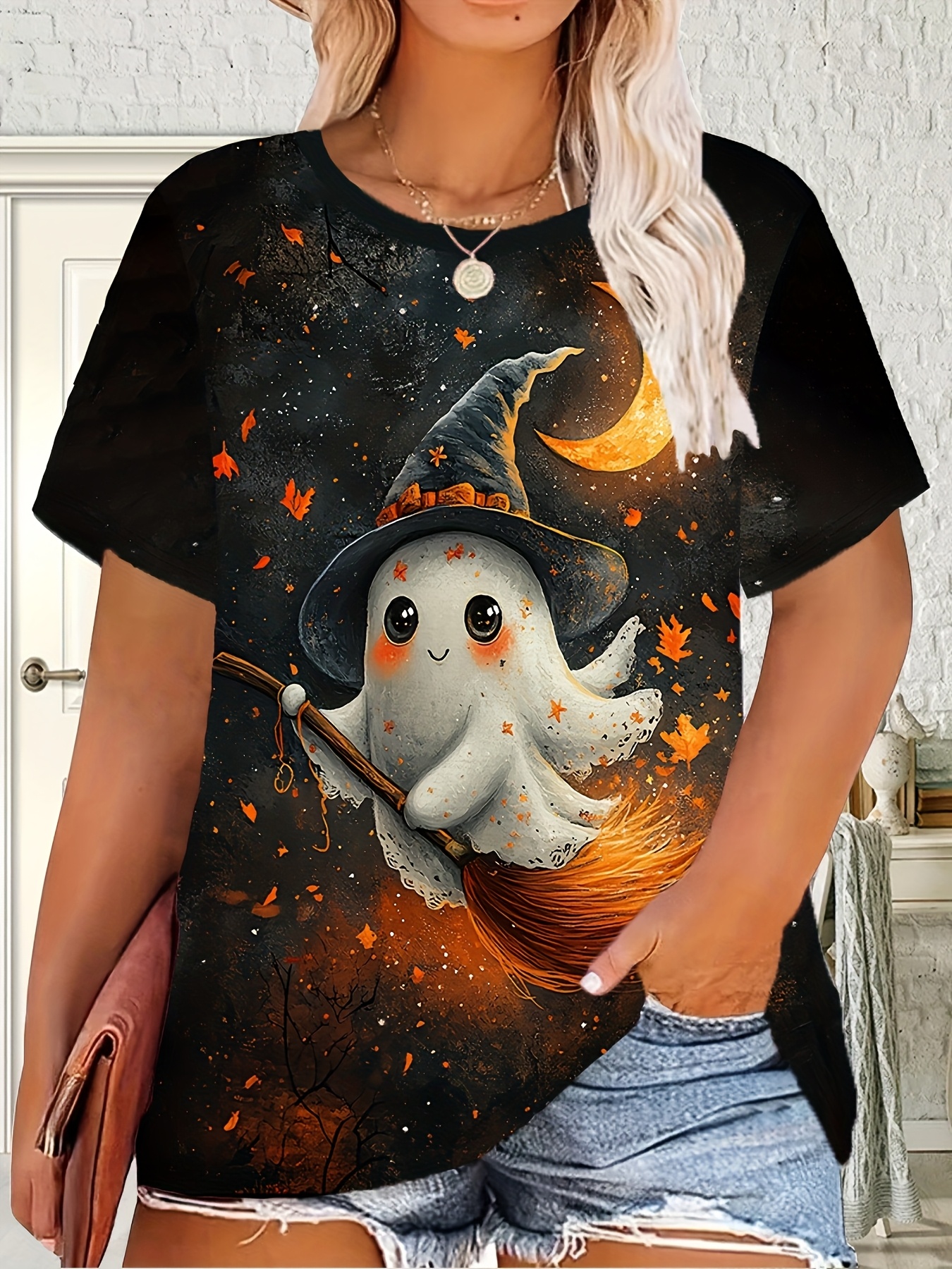 Plus Size - Women'S Plus Size Halloween Ghost Print T-Shirt - Cute Witch Hat & Broom Design, Breathable Polyester Blend, Round Neck Short Sleeve Top, Machine Washable Casual Summer Outfit, Lightweight & Comfortable for Casual Attire, Halloween Shirts