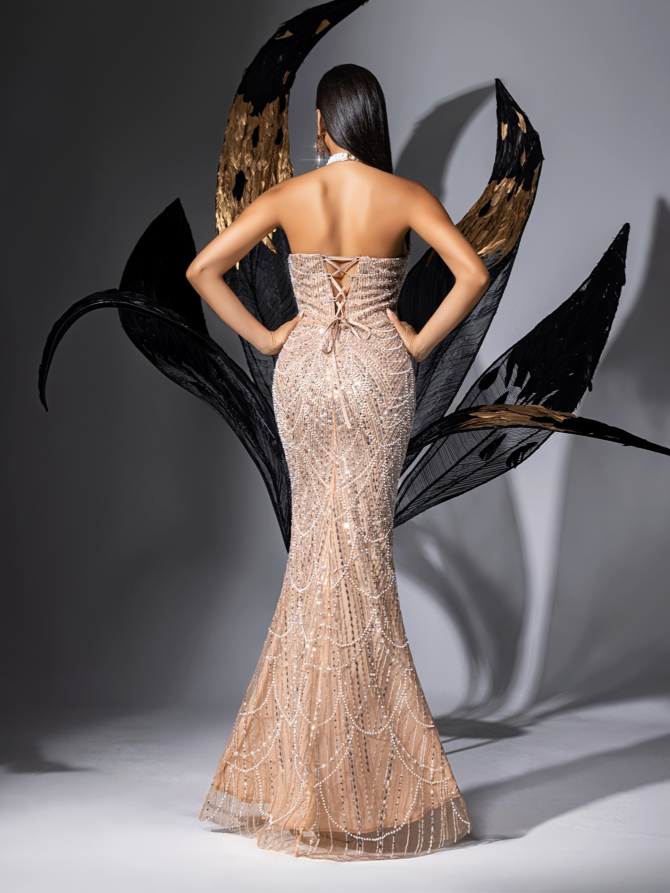 [Elegant Dress] Elegant Sleeveless Formal Dinner Dress | Champagne Halterneck Fishtail for Women - Sparkling Sequins, Mermaid Silhouette, Perfect for Galas & Weddings, Sophisticated Style, Intricate Embellishments