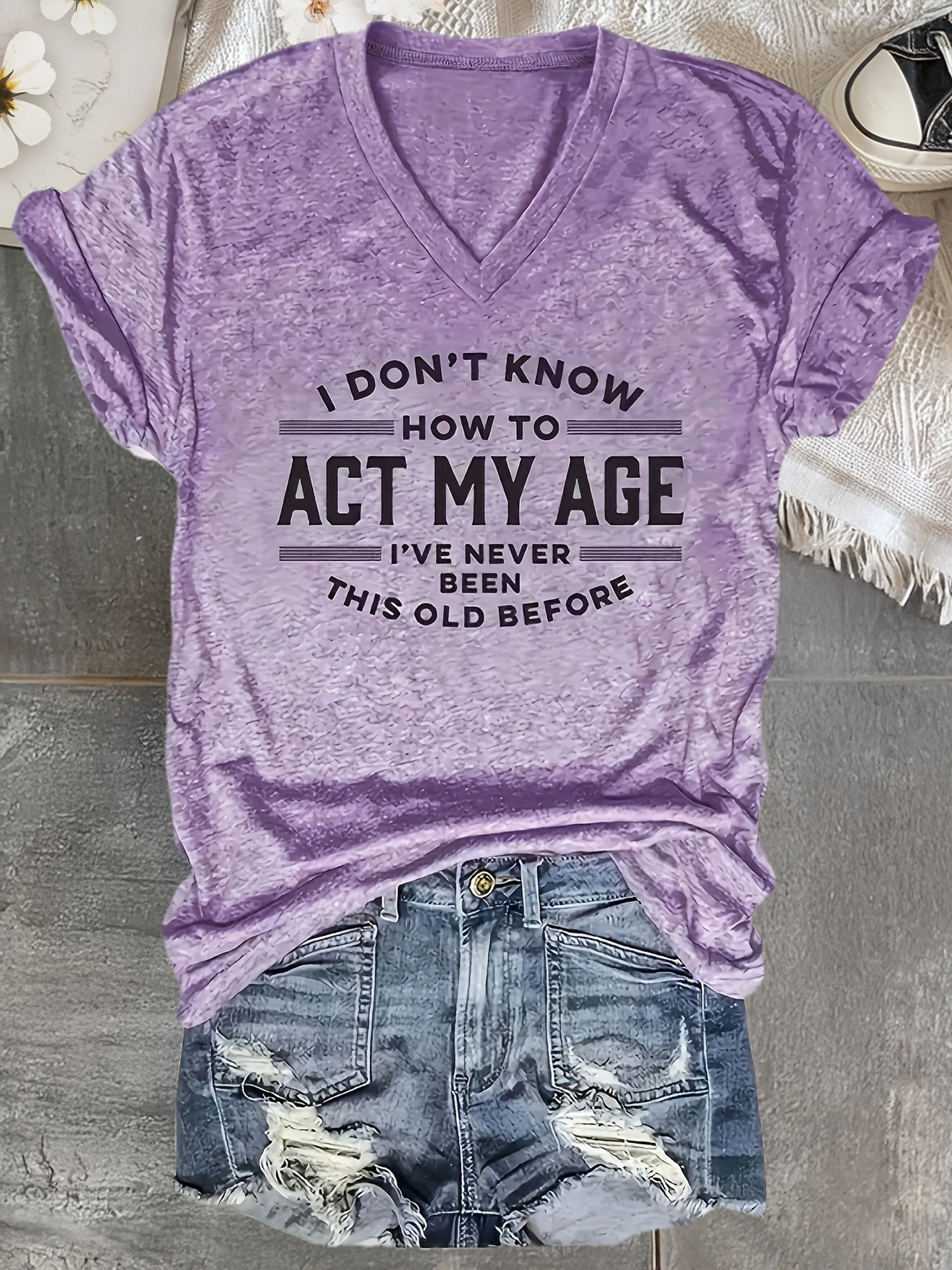 [Purple, Casual T-Shirt] Light Purple Relaxed Fit Women's Casual V-Neck Short Sleeve T-Shirt | Bold "I Don't Know How to Act My Age" Slogan Print | Machine Washable Summer Top