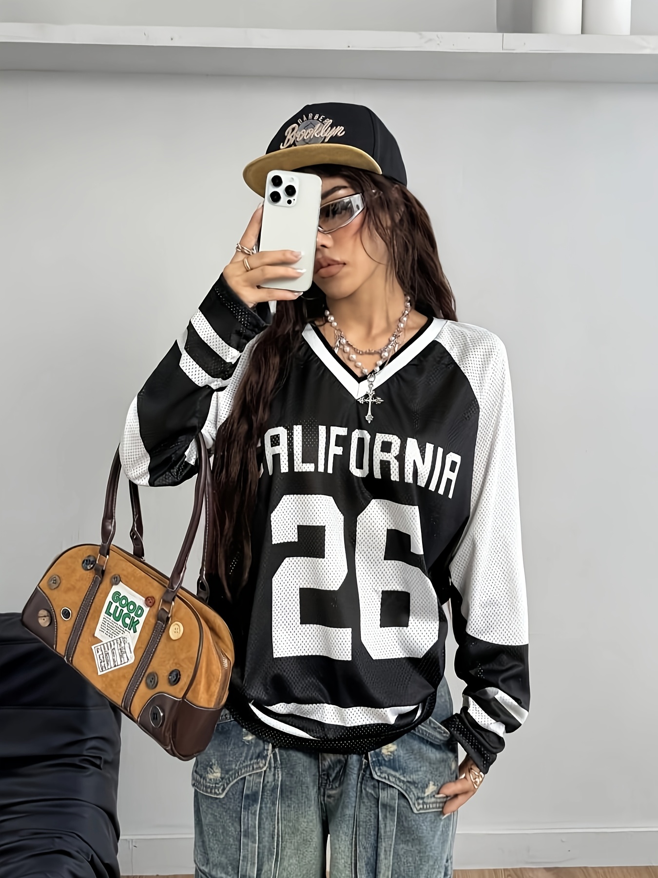 [Soft Stretch V-Neck T-Shirt] Soft Stretch Fabric Women's Casual V-Neck Long Sleeve T-Shirt | California 26 Letter Print, Black & White Striped Mesh Overlay, All-Season Comfort for Casual Attire | Vneck Design | Mesh Overlay Shirt
