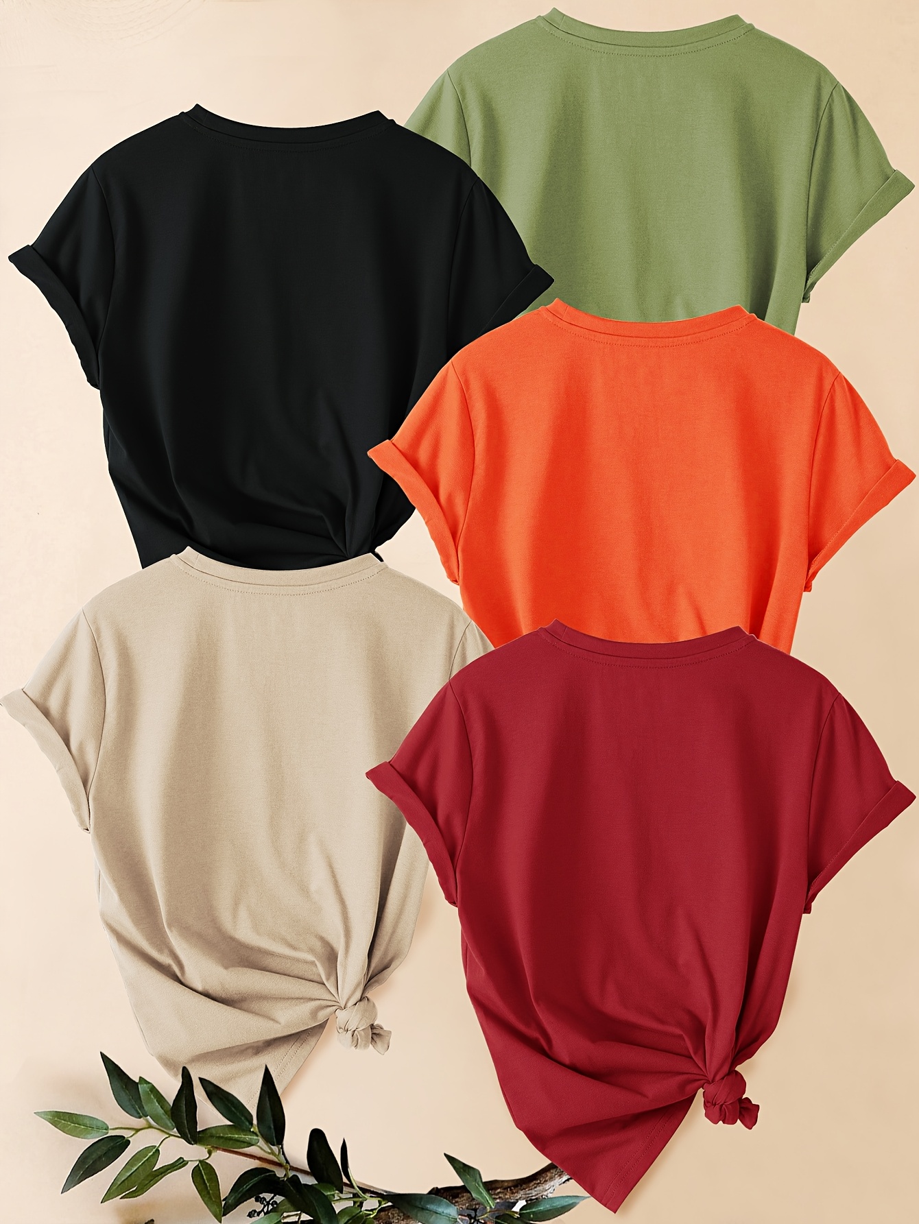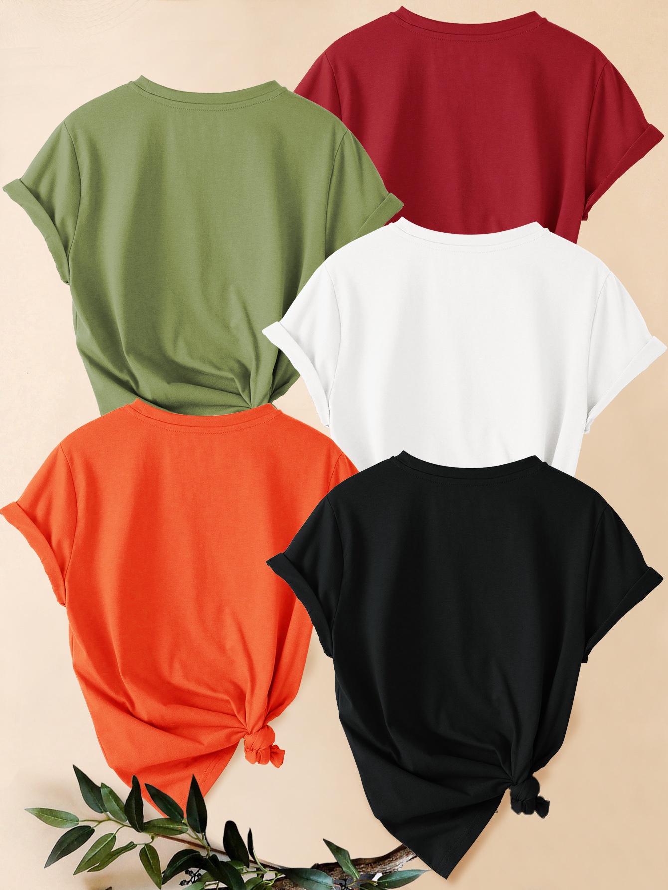 [Versatile Summer T-Shirt Set] 5pcs Versatile Summer T-Shirt Set, Women's Simple Floral Short Sleeve Chrysanthemum Print Round Neck Loose Fit Casual Fashionable Commute Vacation Everyday Top in Multiple Colors 1XL-5XL